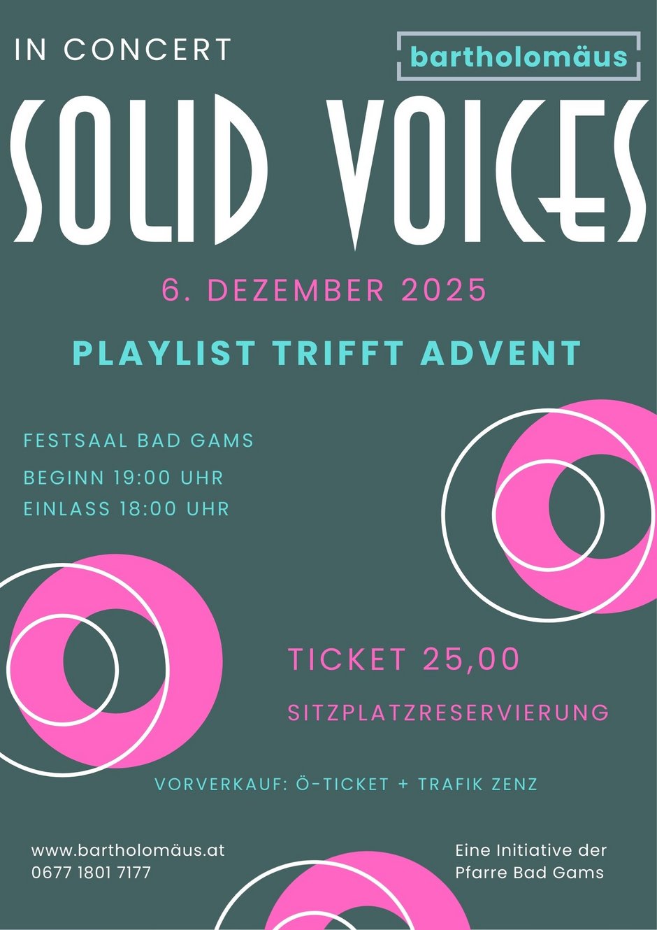 Die von der Musik ausgehende Faszination und die Freude am Singen haben uns zusammengeführt. Im Laufe der Jahre entwickelte sich das Ensemble "SOLID VOICES" zu einer Stimmengemeinschaft mit großem Repertoire, welches vom Volkslied über Gospels und Spirituals, bis hin zu Popsongs reicht. Viele Konzerte und vier Tonträger sind das Ergebnis dieser gemeinsamen Leidenschaft.